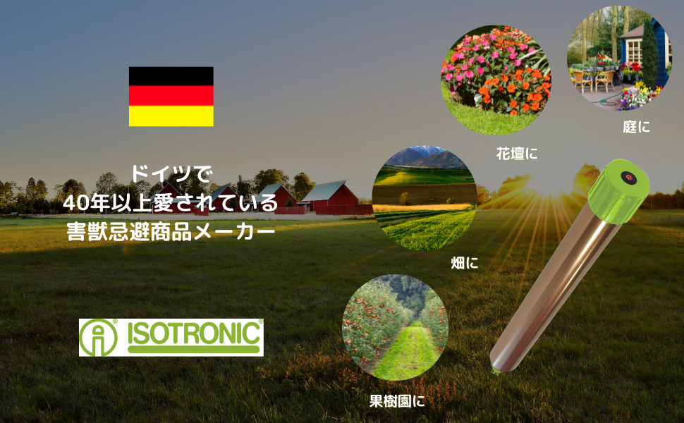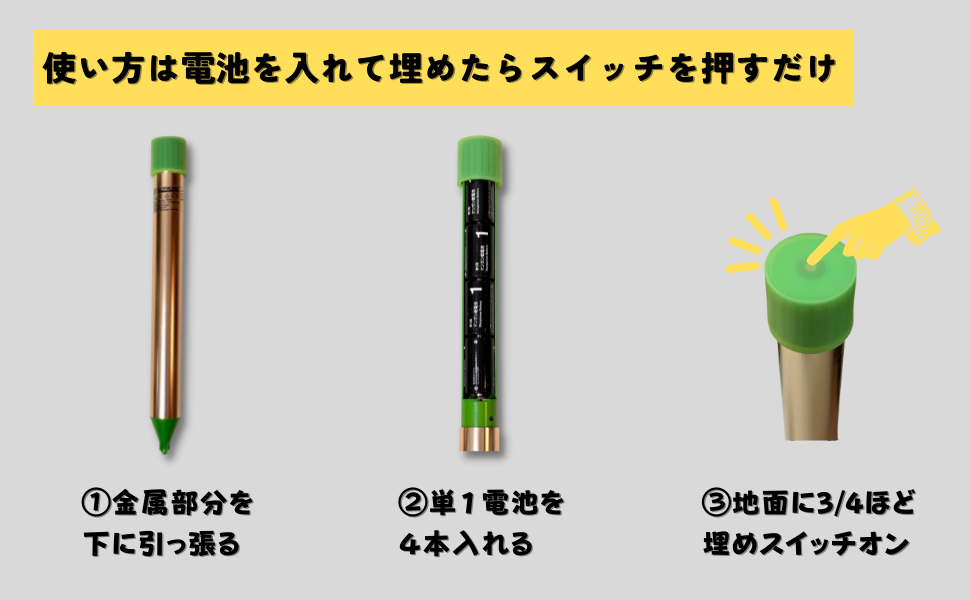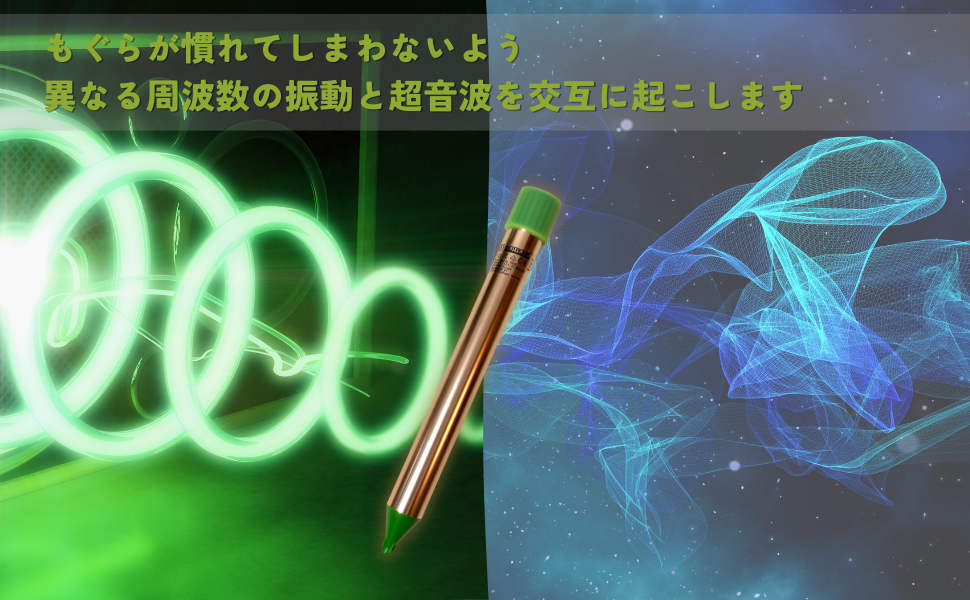 • 超音波と周波数振動を繰り返し発生させるもぐら撃退器。